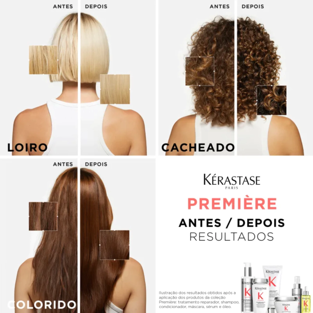 Kérastase descobriu a razão por trás dos danos que sempre voltam: cálcio. Por ser mais poroso, o cabelo danificado absorve 3 vezes mais cálcio da água que o cabelo saudável, levando a uma sobrecarga de cálcio. A cada contato com a água, o cálcio se acumula, criando danos persistentes. O cálcio se infiltra entre as cadeias de queratina e quebra seus elos, tornando o cabelo rígido, duro e fácil de quebrar. Por fora, o cálcio se acumula nas escamas, deixando os cabelos ásperos e opacos. Première é um tratamento reparador com dupla ação que elimina a sobrecarga de cálcio no cabelo, repara as cadeias de queratina rompidas, reverte radicalmente os danos recorrentes e recria 99% da força original do cabelo.
